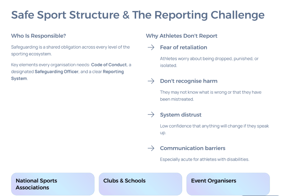 Attending this forum was a valuable reminder that safeguarding is a shared responsibility across the entire sporting ecosystem — from national bodies to coaches, volunteers, and event organisers.